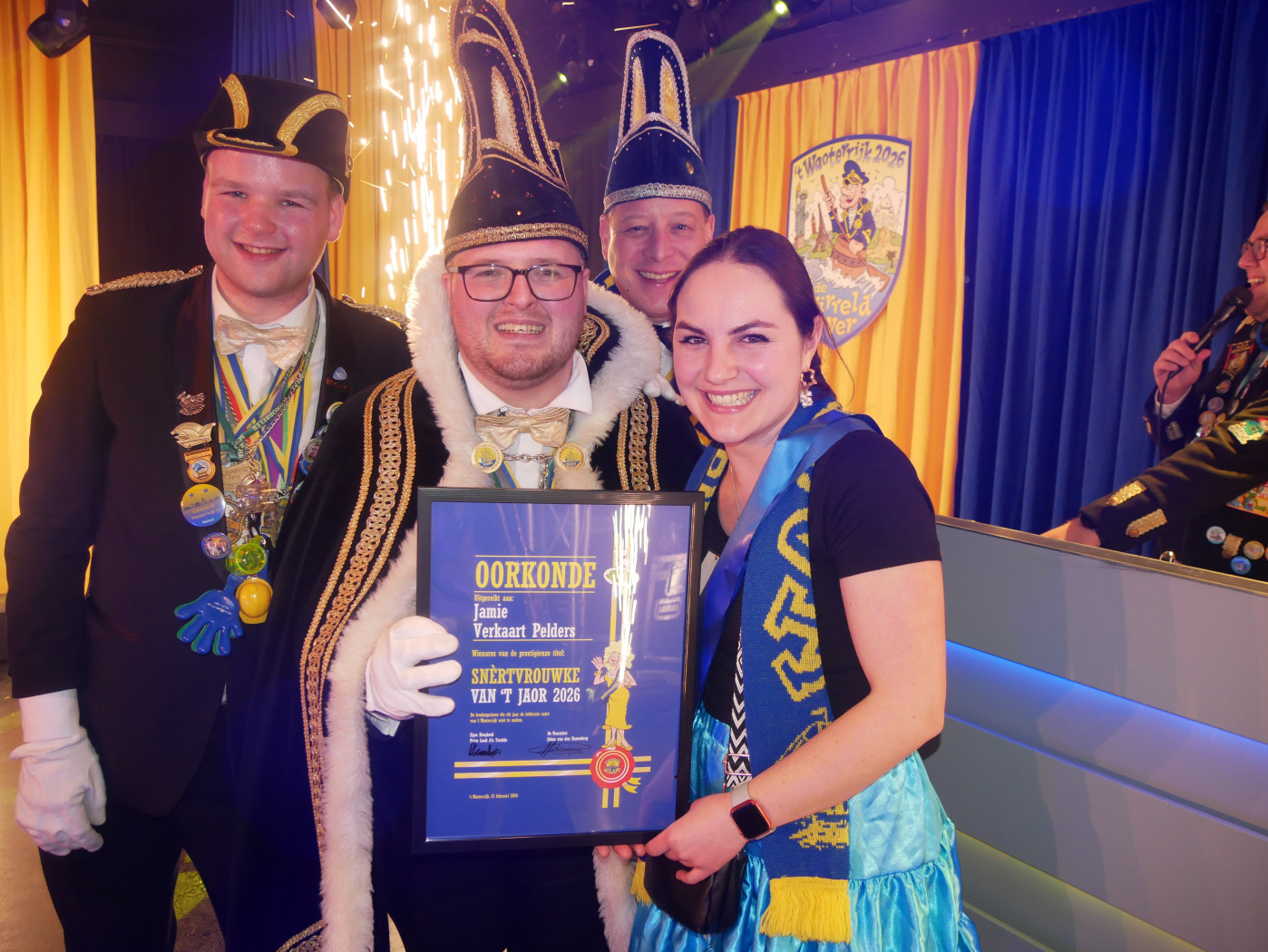 Zij maakten 10 liter heerlijke snert naar eigen recept, welke tijdens ’t openingsbal van ’t Waoterrijkse carnaval werd geserveerd. Er werd door de vele gasten gretig geproefd en gestemd. Uiteindelijk ging Jamie Verkaart Pelders met de eer aan de haal, want haar snert kreeg de meeste stemmen. Zij mag zich heel 2026 Snèrtvrouwke van ’t Jaor noemen. Uit handen van Prins Luuk d’n Twidde kreeg Jamie een oorkonde en mooie sjerp uitgereikt.