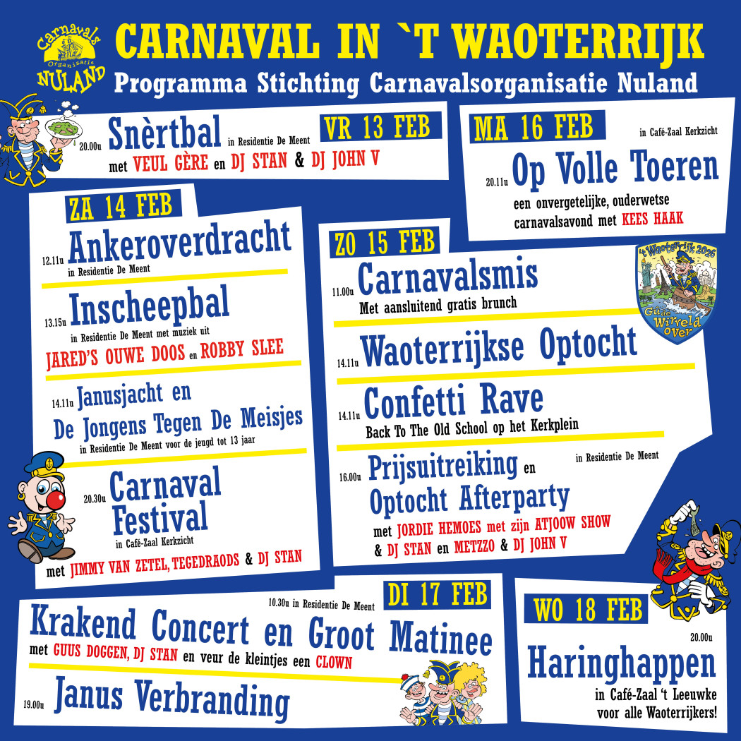 Het belooft weer een gigantisch feest te worden in 't Waoterrijk deze Carnaval. Onderstaand vind je het officiële programma van Stichting Carnavalsorganisatie Nuland. Voor een uitgebreid overzicht van wat er verder nog allemaal te doen is in ons prachtige Waoterrijk verwijzen we je graag naar deze pagina.